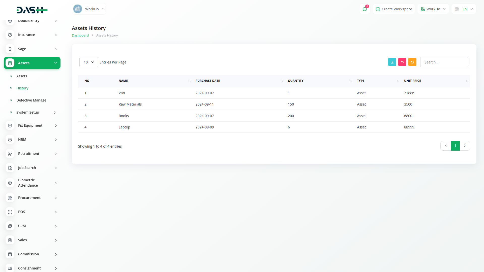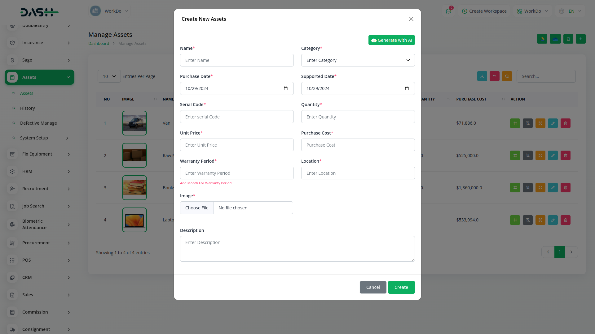 No nosso módulo de ativos, implementamos um sistema robusto para o gerenciamento de ativos simplificado. Inclui detalhes vitais de ativos: "Nome", "Código de série", "Prez", "Quantidades" e "Data de compra". Este sistema garante o rastreamento preciso de inventário e responsabilidade financeira, aumentando a eficácia operacional.