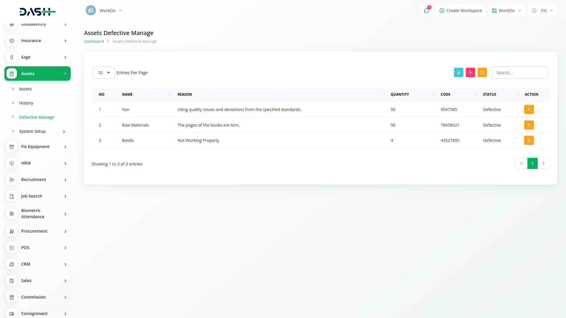 Dentro deste módulo, você pode acessar o histórico de ativos, rastrear ativos extras e distribuição, deduzir itens defeituosos e atualizar seu status para potencial retirada e reutilização.
