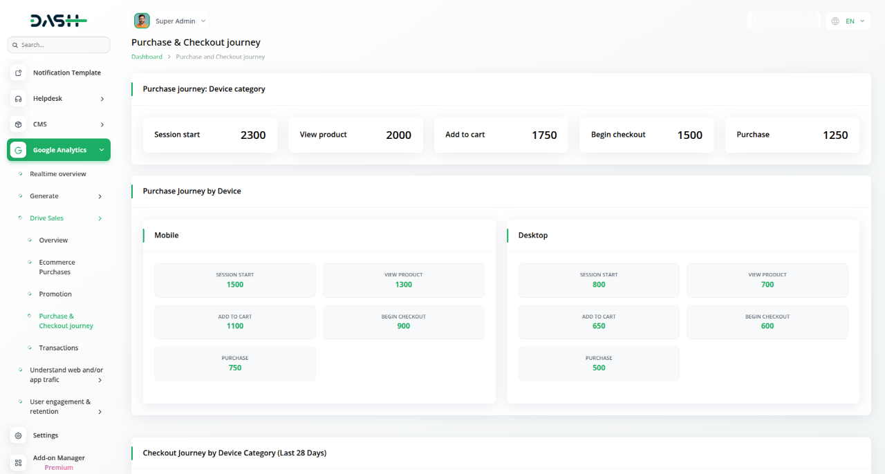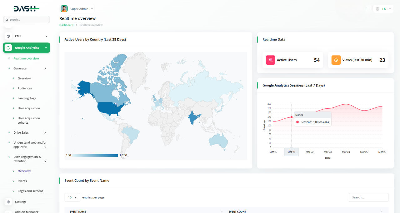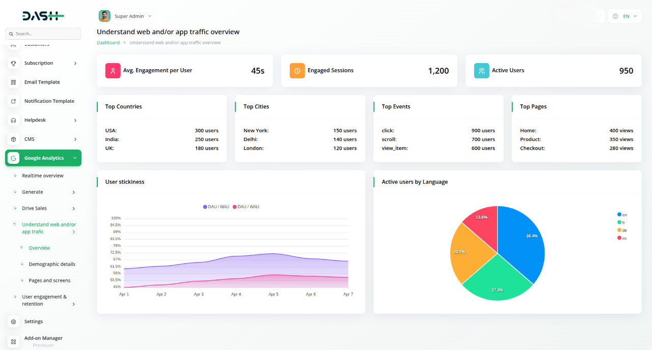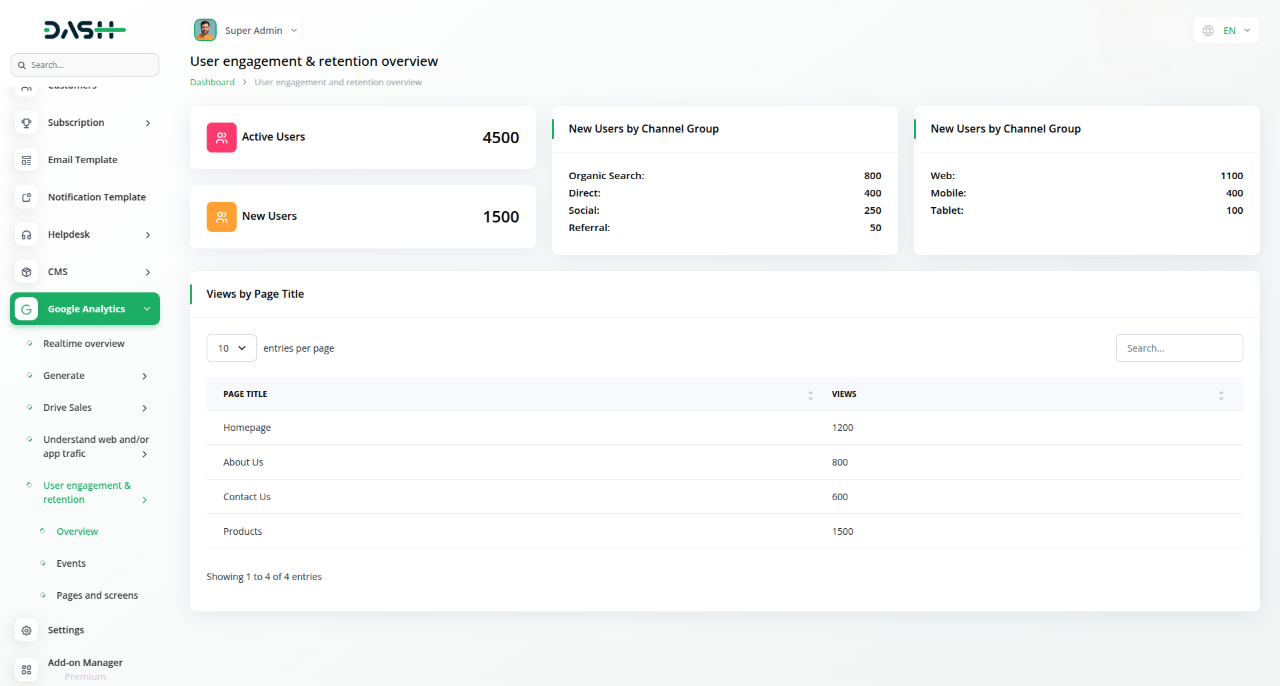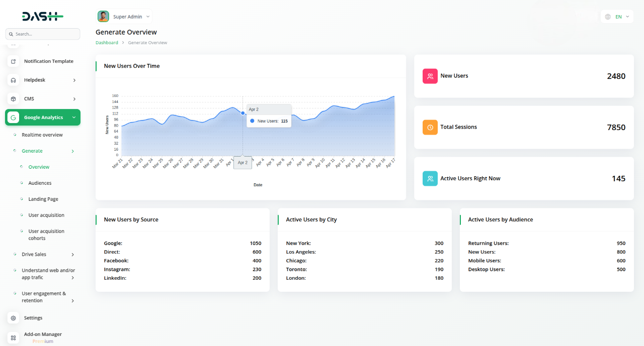 The Google Analytics Add-On seamlessly integrates powerful insights into your dashboard, giving you real-time visibility into website traffic, visitor geography, and device usage—all without leaving the platform. With easy setup and live syncing from Google Analytics, you can monitor performance, track user behavior, and optimize strategies in one centralized space.