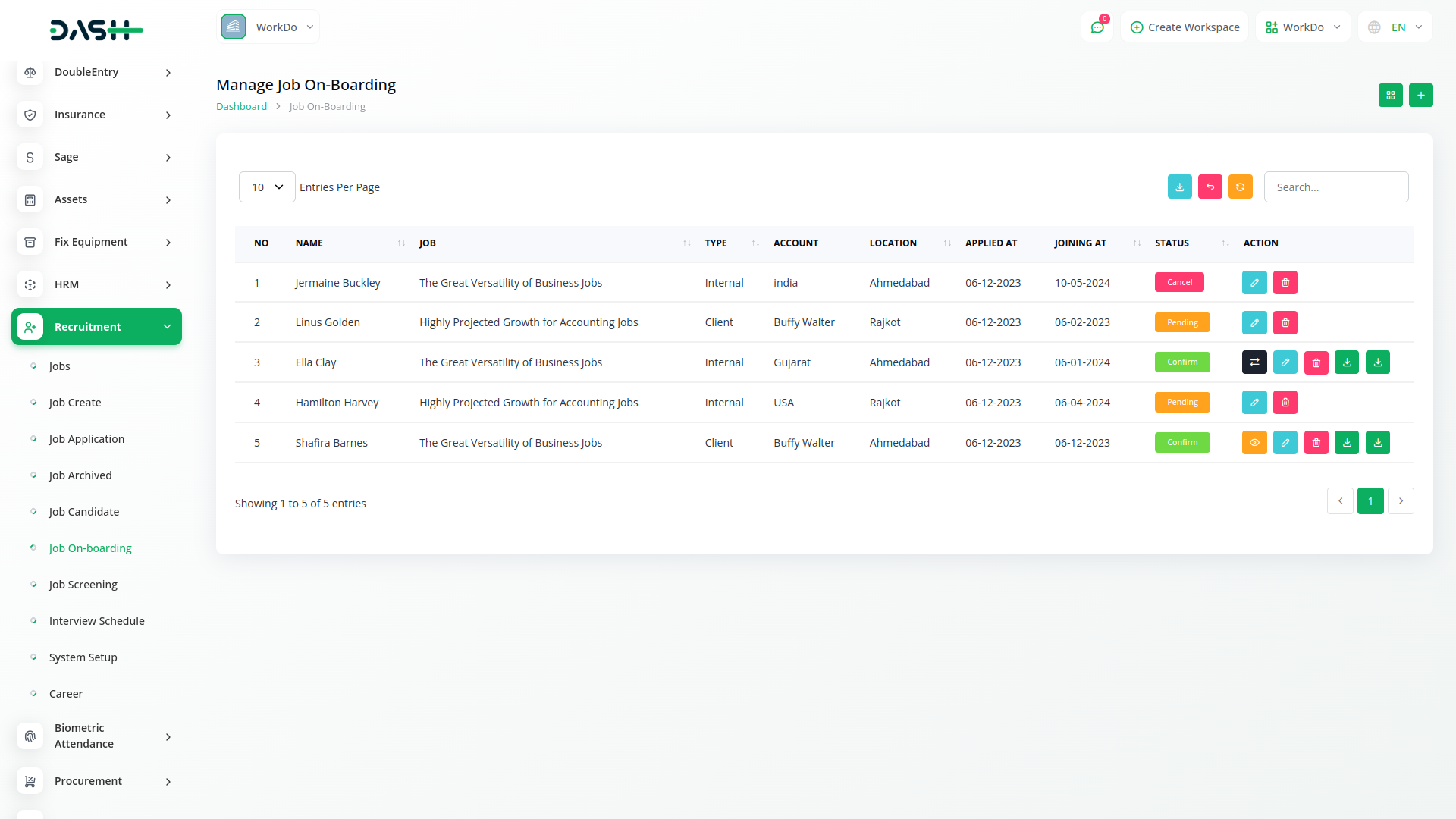 In the Recruitment module, users can view comprehensive job details, including descriptions, questions, applications, attachments, notes, to-do lists, and activity logs. This feature ensures all relevant information is accessible in one place, streamlining the job posting process and allowing for better organization and management of each job listing.