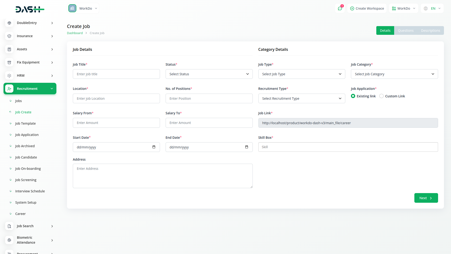Within the recruitment module, the Jobs Creation page offers a streamlined process for creating new job listings. Users can input essential details including job titles, descriptions, requirements, and any other pertinent information. This intuitive interface allows for the customization of each listing to attract the right candidates. By simplifying the task of posting job openings, users can quickly reach potential candidates while maintaining consistency and professionalism in their job postings.
