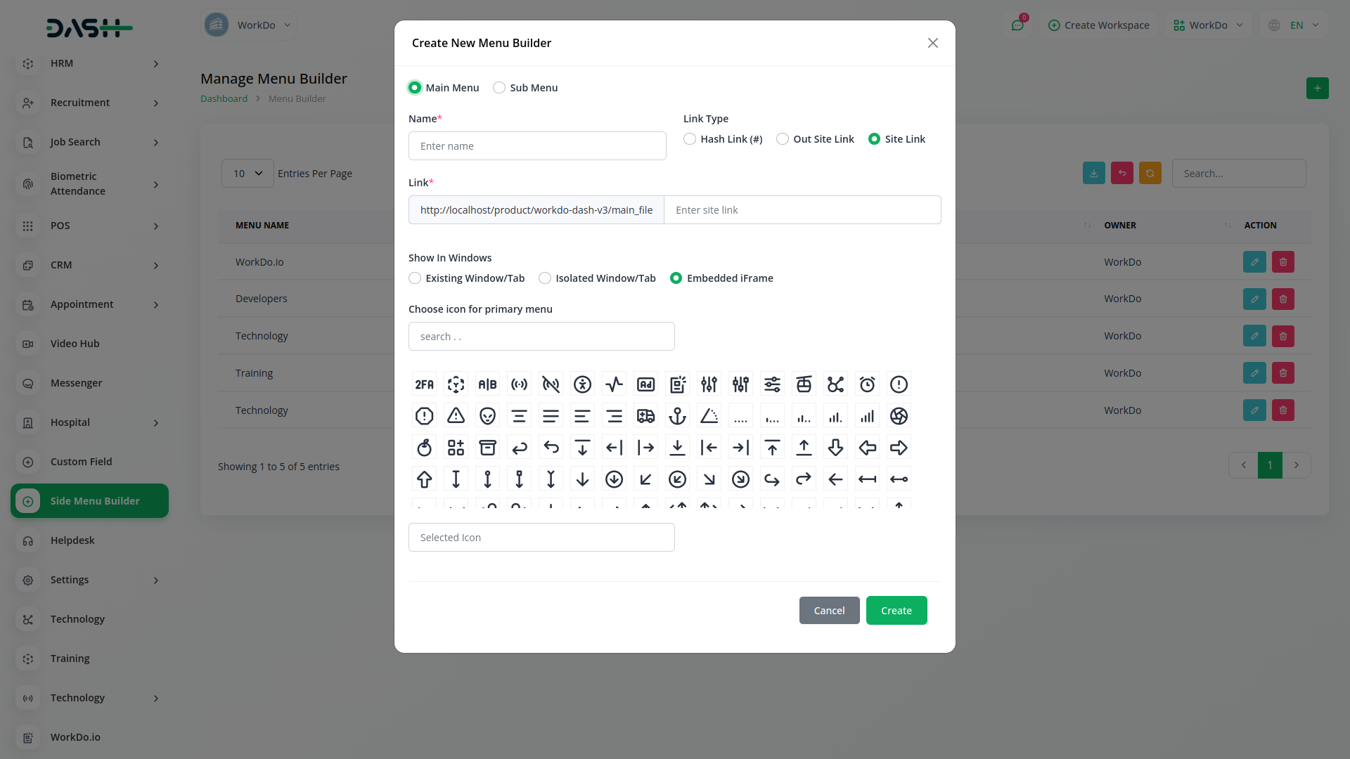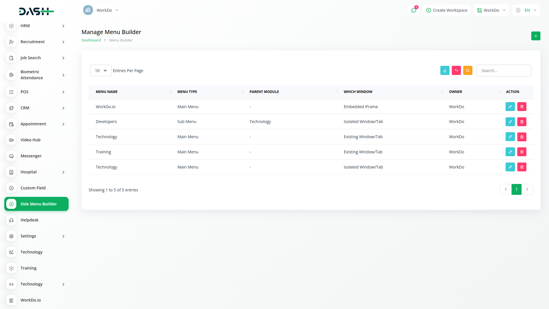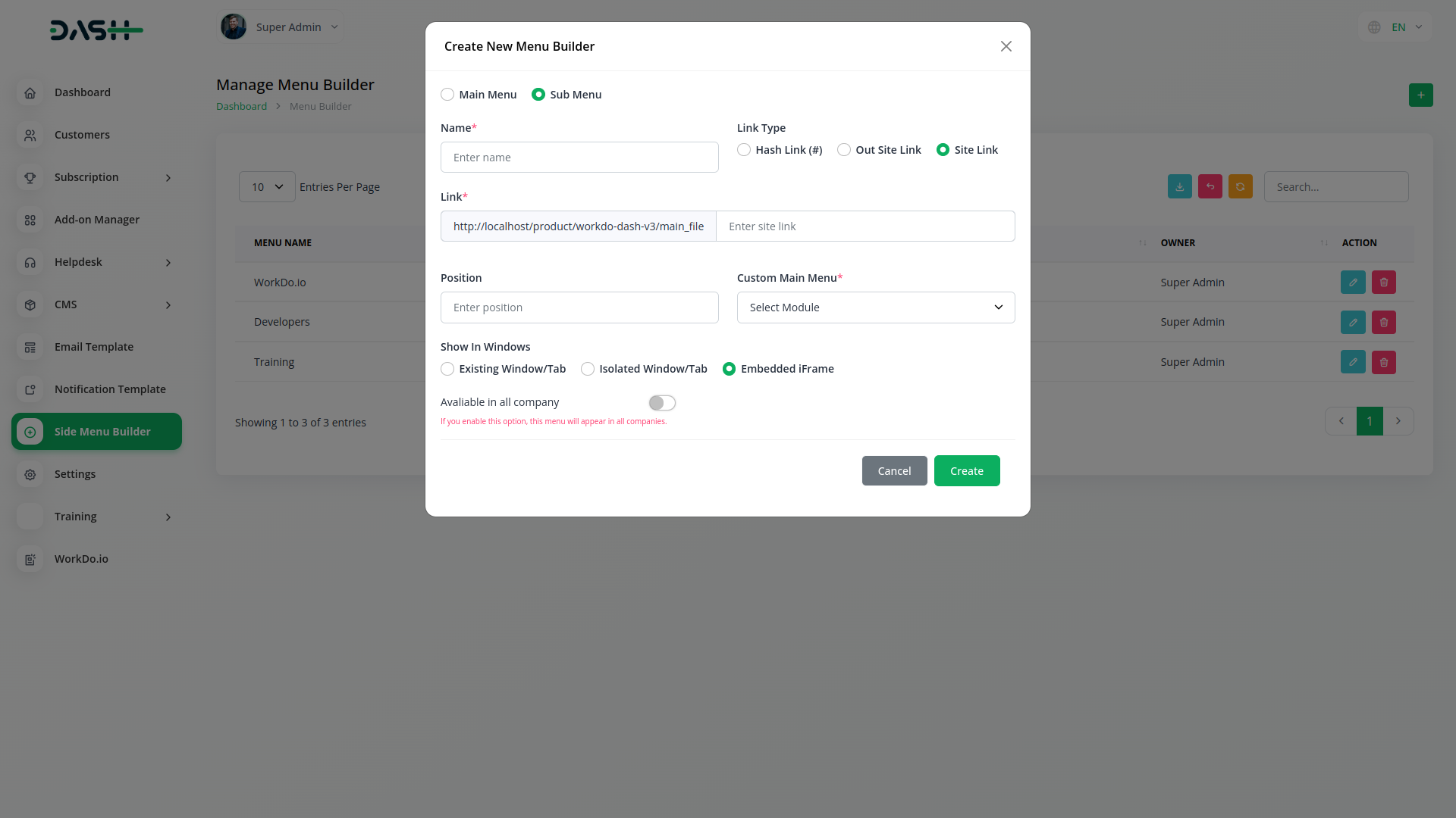 You can create a side menu by simply clicking the Create button. In which you can manage the menu and also edit that menu according to your own. And you can delete that menu. The sidebar can be created from both the company side and the super admin side. Additionally, menus created and enabled from the Super Admin side are visible across all companies.