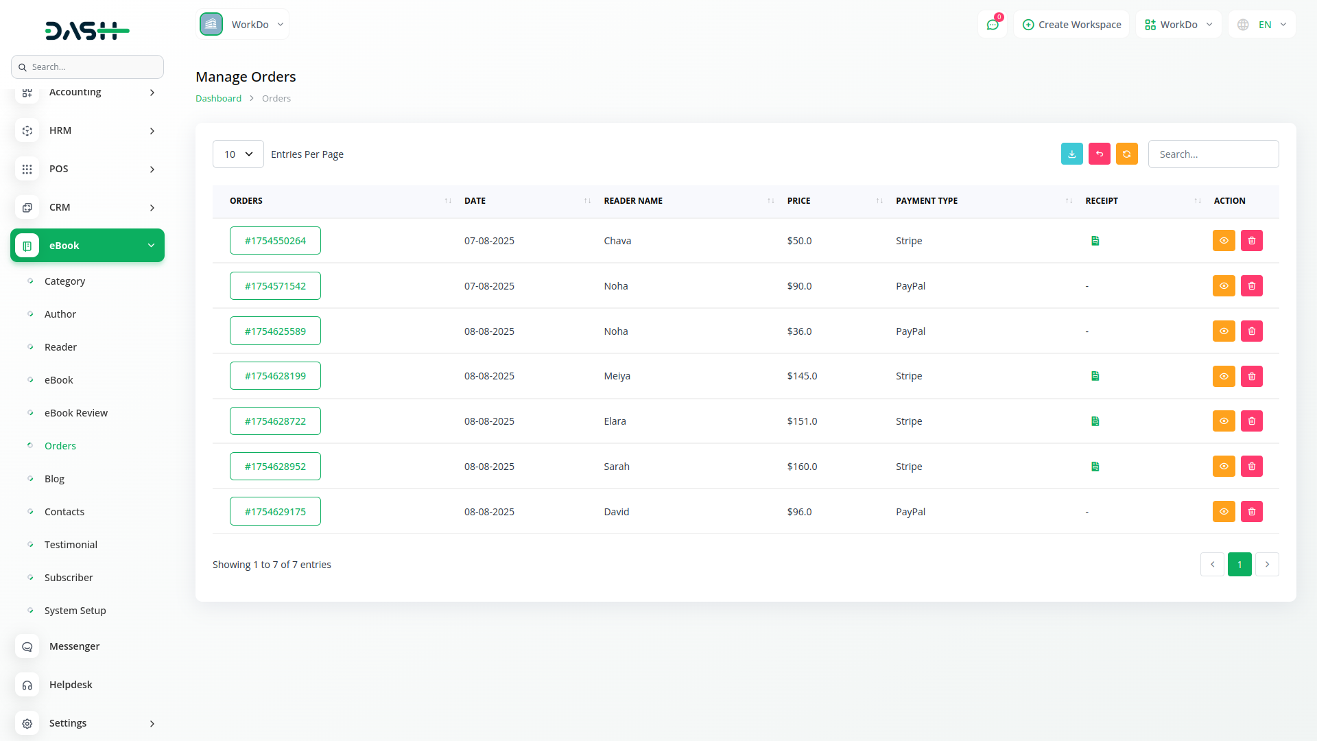 Gerenciar todos os pedidos e comunicações de leitores de um local central. Processar pagamentos, acompanhar o status dos pedidos, gerenciar contas de leitores e lidar com mensagens de formulário de contato. O sistema processa automaticamente as entregas de livros digitais e mantém registros detalhados de todas as transações para facilitar o gerenciamento de negócios.